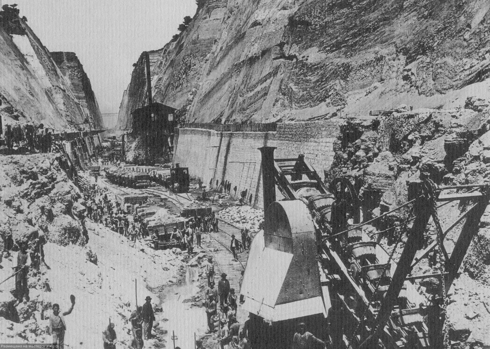 Строительство Коринфского канала велось в течение более, чем десяти лет (1881—1893) силами двух с половиной тысяч рабочих, которые использовали самые лучшие на то время машины. Было вынуто приблизительно 930 000 кубических метров земли и камня. 7 августа 1893 года было устроено торжество по случаю открытия Коринфского канала.