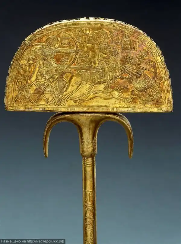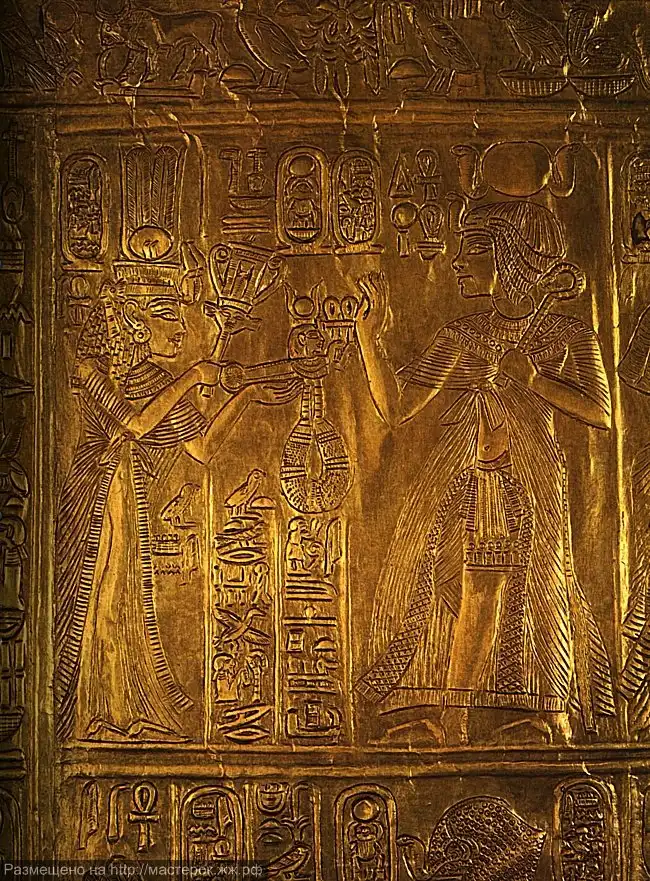 Удивляет и состояние практически всех находок. Огромный обшитый золотыми листами саркофаг сразил исследователей своим блеском: ничуть не запылившись и не помутнев, он простоял более трех тысячелетий. Отличным было и состояние других предметов, но вместе с тем внутренние деревянные гробы, как отмечал Картер, были сильно попорчены сыростью, хотя наружный и остался совершенно цел. Создается впечатление, что те, в отличие от всего прочего, хранились в плохих условиях, а ведь находки-то лежали в одном помещении. И еще. В первой камере ученые обнаружили четыре колесницы, которые из-за своих огромных размеров не могли быть внесены в гробницу целиком и были распилены! Интересно, чем? Неужели бронзовой пилой?