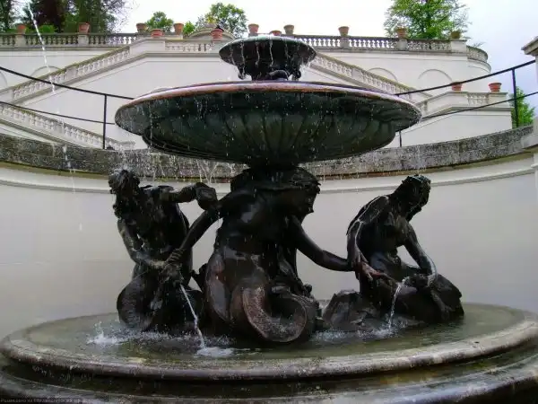 При дворце, на территории 80 га, разбит великолепный парк – настоящий шедевр садово-паркового искусства, при этом умело были использованы крутые взгорья вокруг долины Грасвангталь. Террасы, каскады, беседки в разных стилях, английский ландшафтный дизайн – все это представляет собой единую композицию восхитительной красоты. Непосредственно за замком имеются галереи с липовыми сводами и фонтан в виде каскада: вода стекает вниз по тридцати мраморным ступеням прямо в бассейн с фонтаном, украшенным скульптурной группой Нептуна.
