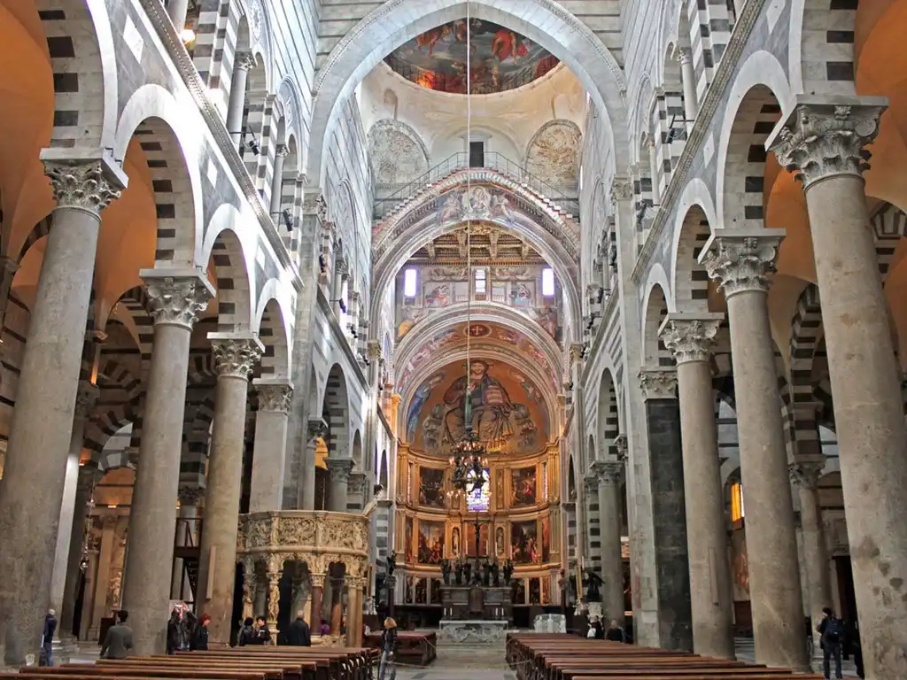 Это оригинальное строение в пизанском варианте романского стиля с пятью нефами продольными и тремя в трансепте. Колонны, украшающие собор и колокольню, очень разные - что пизанские моряки привозили из своих набегов, то и шло на украшение. Мозаики внутри были созданы под сильным влиянием Византии, а в форме арок чувствуется влияние Востока. Бронзовые двери главного входа были созданы в мастерской Джамболоньи. Средневековый интерьер сильно пострадал после пожара 1595 г. От пожара уцелела центральная мозаика в апсиде. Голова св. Иоанна на мозаике - последняя работа Чимабуэ, который умер в Пизе в 1302 г. Также сохранилась резная кафедра работы Джованни Пизано - один из шедевров средневековой скульптуры. В соборе похоронены покровитель Пизы св. Раньери, император Священной Римской империи Генрих 7, папа Григорий 8.