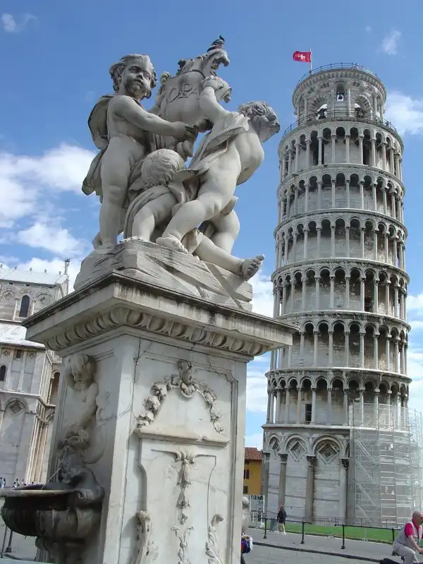Падающая башня (Torre pendente), колокольня собора, то, ради чего, собственно, в Пизу и едут. Падать башня начала уже во время строительства, которое началось в 1173 г. и велось почти двести лет. Большой перерыв в строительстве был связан с непрерывными войнами с Генуей, Луккой и Флоренцией. В 1272 г. строительство продолжил Джованни ди Симоне. Он попытался компенсировать наклон и уменьшил следующие этажи в размере. В результате башня наклонилась в другую сторону. В 1284 г., после сокрушительного поражения от Генуи, строительство снова остановили. Седьмой этаж достроили только в 1319 г., а помещение, где находятся колокола, - в 1372 г. Здание продолжало медленно наклоняться в течение веков. По легенде, идущей от секретаря Галилео Галилея, ученый бросал с башни два ядра разной массы, чтобы доказать свою теорию о падении тел.