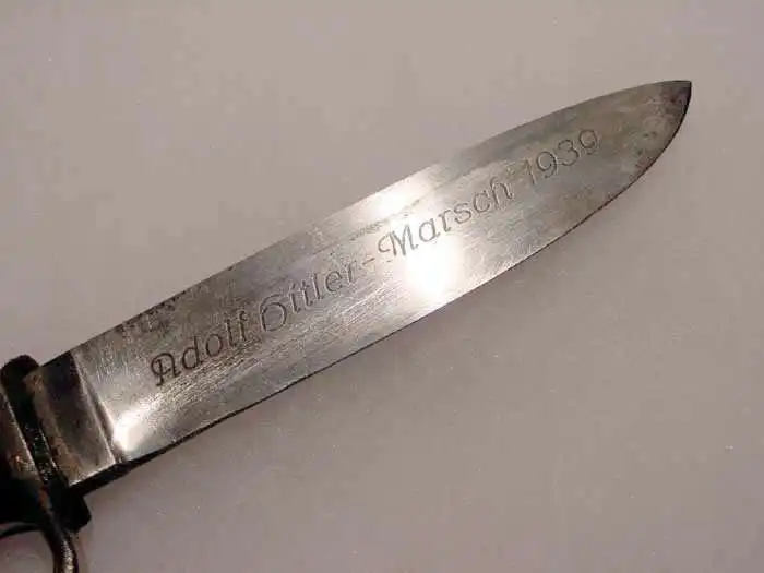 На клинках ножей сначала размещалась травленая надпись «Blut und Ehre» («Кровь и честь») – девиз организации гитлерюгенд. В настоящее время использование этого девиза в Германии является преступлением, но английская версия девиза не подпадает под эту статью. Также, на некоторых ножах была выгравирована подпись руководителя организации Бальдура фон Шираха.