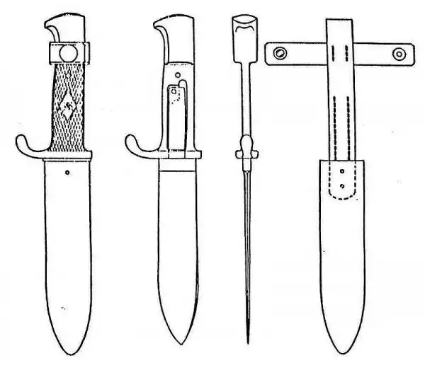Рукоять состояла из двух черных бакелитовых накладок, на одной из которых могла быть эмблема гитлерюгенда – красно-белый ромб со свастикой. Головка рукояти была стилизована под птичью голову. Гарда была загнута в сторону рукояти и прикрывала указательный палец. Головка рукояти и гарда были никелированными, что в сочетании с черным цветом рукояти и кожаных ножен выглядело впечатляюще.