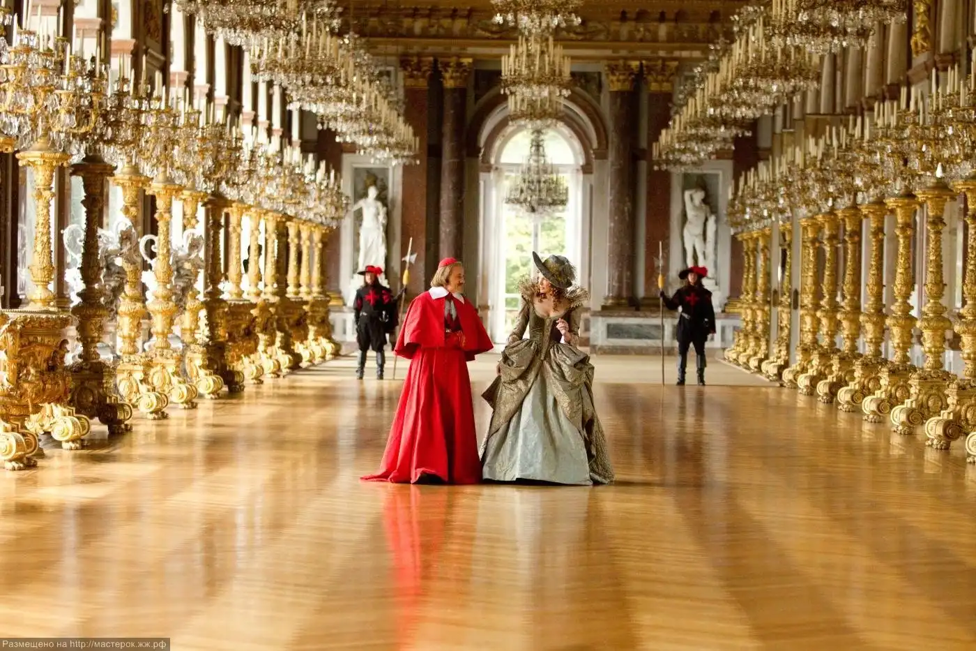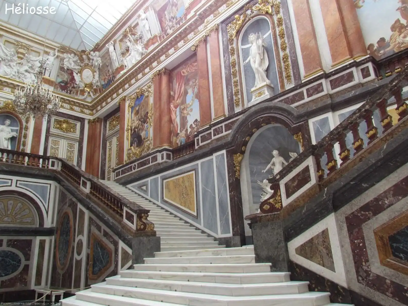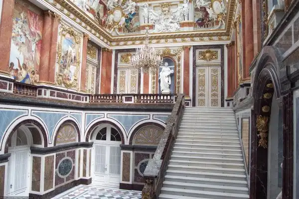 С лестницы просматривается анфилада нарядных покоев в стиле Людовика ХIV-го, так называемые «Парадные апартаменты». Эти помещения открываются «Гвардейским залом», где выставлены алебарды королевской стражи.