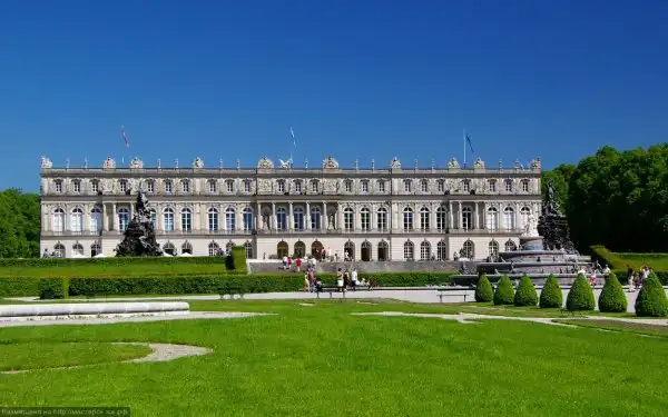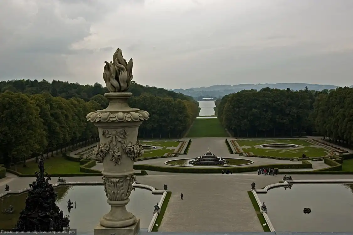 Липовые аллеи замка ведут к берегу озера и определяют симметрию всей композиции парка. У подножия большой наружной лестницы начинаются французские сады со стилизованными партерами, гравийными дорожками и орнаментальными садами-коврами. Центром восстановленных в последние годы фонтанов является созданный в 1883 году источник Латоны, копия источника в Версале. Но сам король не стремился полностью копировать замок и его архитектурный облик, а скорее к реконструкции стиля. Так можно заметить роскошную лестничную клетку, построенную Франко д' Орбей для короля Солнце в Версале.