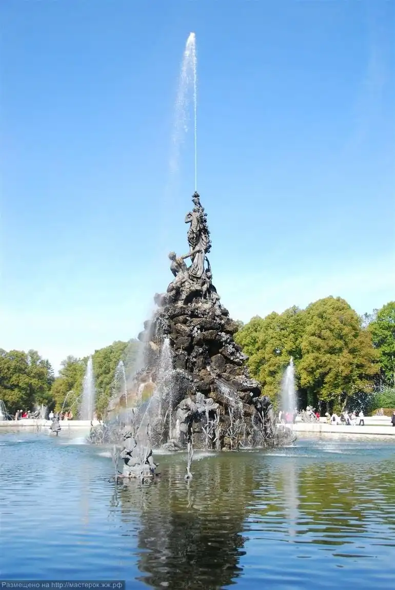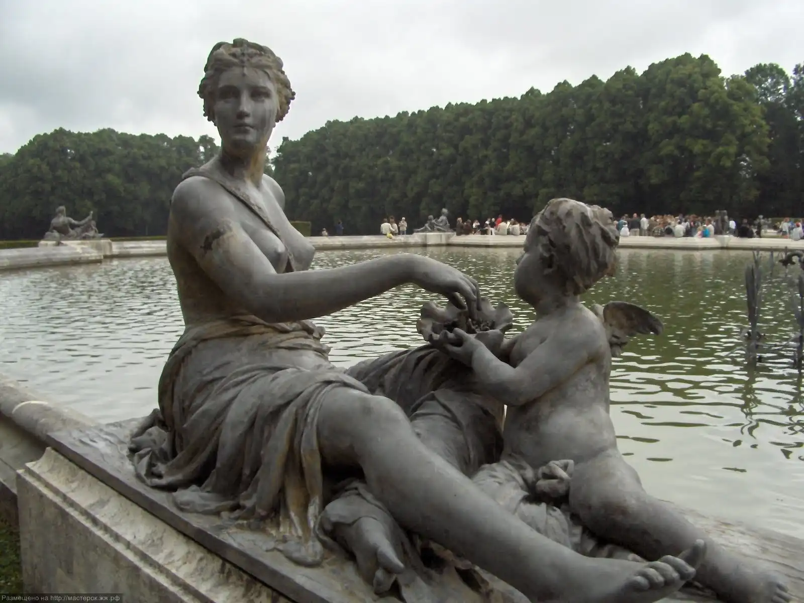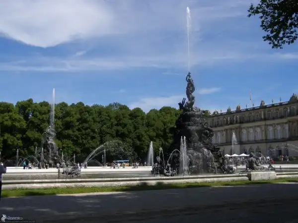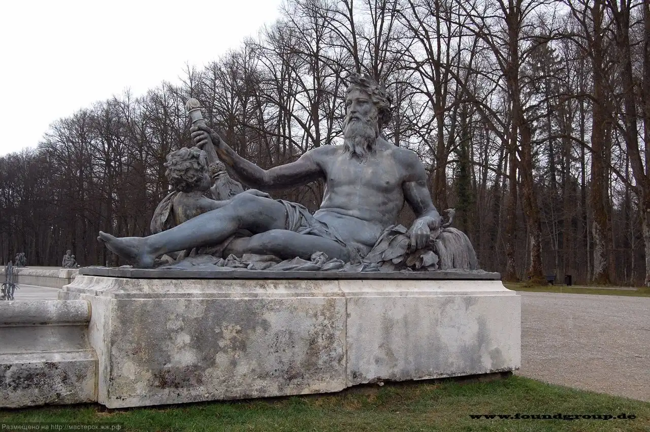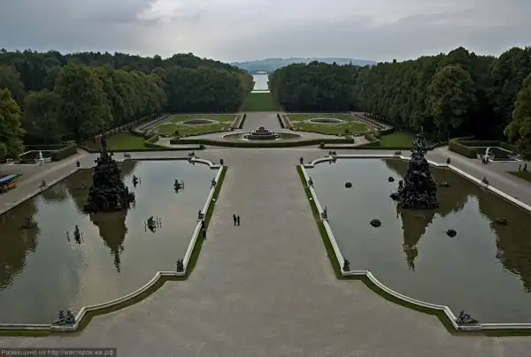 21 мая 1878 года в основание замка был заложен первый камень. Тремя годами позже это масштабное сооружение было уже вчерне готово. В 1884 году король Людвиг II распорядился продемонстрировать ему дворец и парк. Это происходило ночью при включенных прожекторах и бьющих фонтанах. Король остался доволен увиденным.Но продолжим прогулку по территории замка. Пройдя через парк, попадаем во дворец. Роскошная парадная лестница представляет собой копию знаменитой Лестницы Посланников, сооруженной в Версальском дворце для «Короля-Солнце». Ее стены облицованы цветным мрамором. В нишах «поселились» две мраморные нимфы и Богиня Диана. Промежутки между нишами заполнены прекрасными картинами. Хрустальные люстры над Лестницей Посланников – работа мастеров венской фирмы Любмейера.