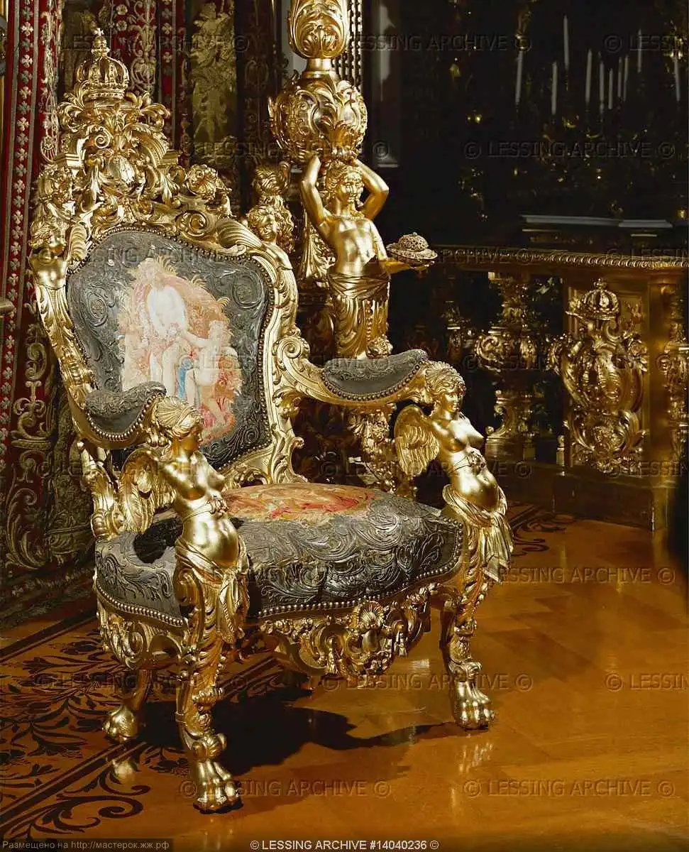 Большинство же работ по отделке залов дворца выполняют баварские мастера. Мастера по дереву выполнят великолепные копии мебели из версальского дворца, а аугсбургская текстильная мануфактура получает заказы для обивки мебели и драпировок.