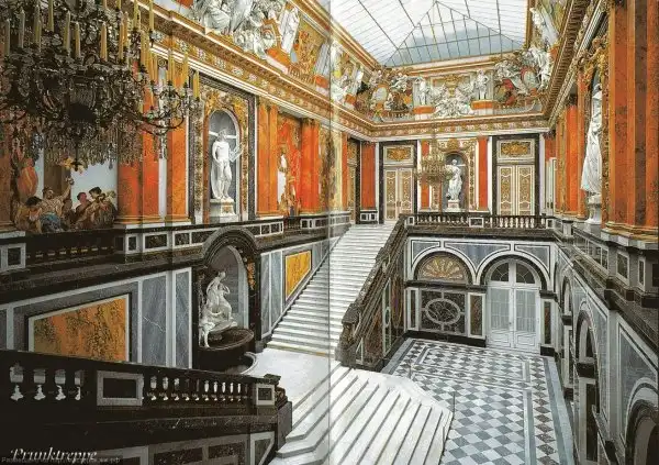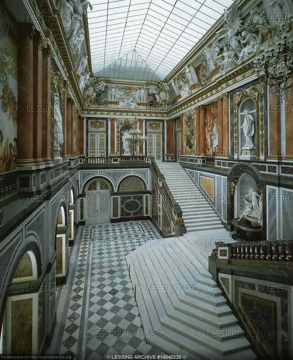 Роскошные лестничные марши представляют собой копию знаменитой Посольской лестницы, которую создал в Версальском дворце Франсуа д’Орбей для «Короля-Солнце» (версальская «оригинальная» лестница была разобрана в 1752 году). Король Людвиг II стремился при этом не к слепому копированию, а, скорее, к воссозданию «в версальском духе». Под невесомой конструкцией современной стеклянной кровли благородные материалы (различные сорта мрамора, позолоченая лепка) и богатые живописные украшения создают торжественное настроение. Цветная облицовка стен выполнена из натурального мрамора различных цветов. Фигуры Дианы и двух нимф в нишах изготовлены в мастерской Филиппа Перрона. Картины принадлежат кисти Франца Виндманна и Людвига Лескера. Великолепные хрустальные люстры изготовлены венской Фирмой Лобмейера.