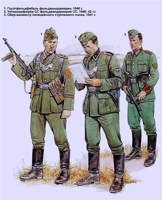 До 1940 г. полевые жандармы носили форму полиции рейха, но с армейскими погонами и нарукавной повязкой, на которой было написано Feldgendarmeriе. В начале 1940 г. все военнослужащие полевой жандармерии получили форму армейского образца со знаками отличия. Самым главным отличительным знаком был специальный металлический горжет с надписью Feldgendarmeriе.