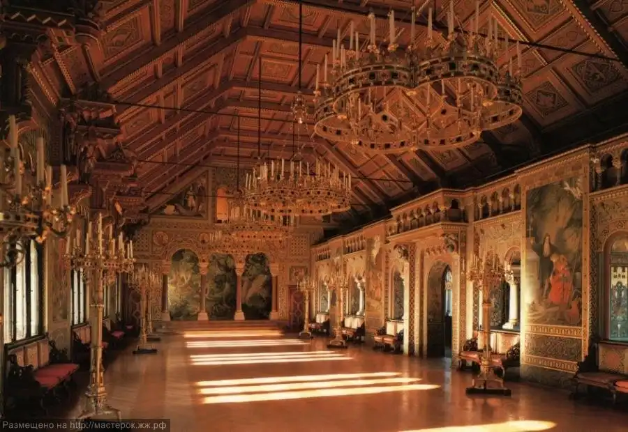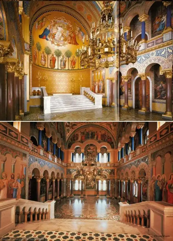 Тронный зал Нойшванштайна выполнен архитекторами Эдуардом Илле и Юлиусом Гофманом в стиле византийской пресыщенной роскоши. Длинные ряды колонн идут через весь двухъярусный зал с украшениями из имитации порфира и лазурита. Заканчивается помещение полукруглой позолоченной апсидой – местом расположения королевского трона. Девять мраморных ступеней ведут к подножию помоста, на котором трон, украшенный золотом и слоновой костью, и должен был располагаться. История распорядилась иначе – монарх умер прежде, чем символ власти был изготовлен и установлен в предназначенном ему месте.