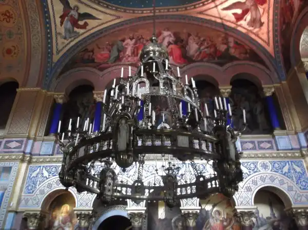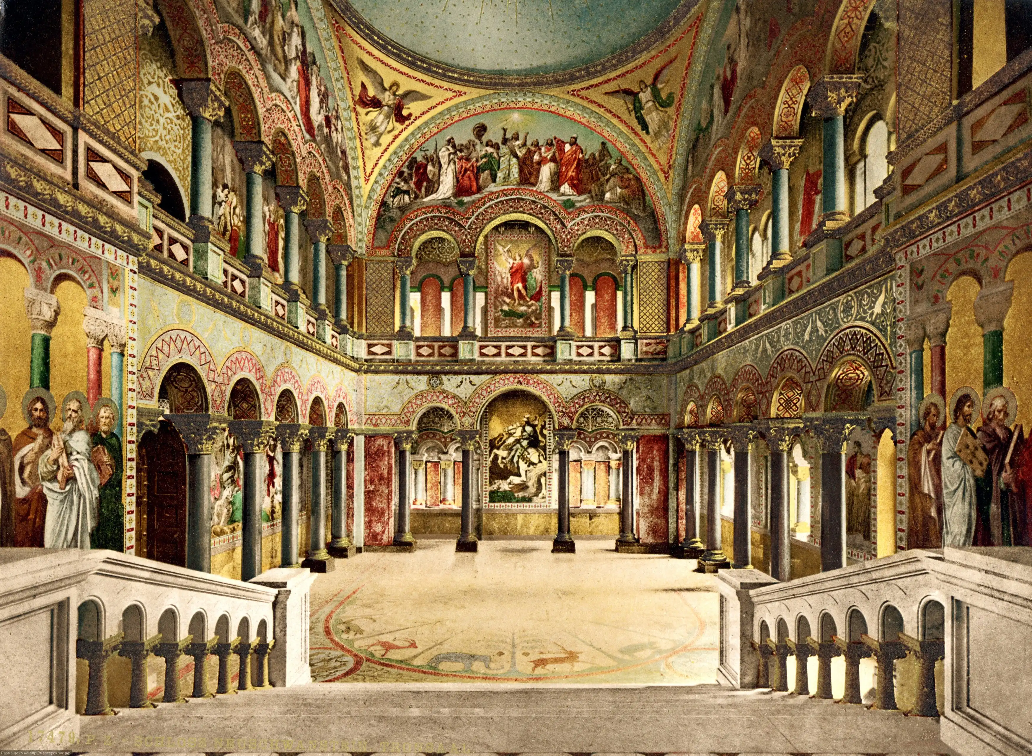 Купол апсиды украшен росписями на теологические темы. Здесь изображен Иисус Христос в окружении богоматери Марии и апостола Иоанна, а ниже расположились фигуры королей, причисленных к лику святых, среди которых уже упоминавшийся небесный покровитель Людвига – Людовик Французский. Дополняет интерьер величественная люстра, выполненная в виде византийской короны. Люстра сделана из позолоченной меди, рассчитана на 96 свечей и весит почти 2 тонны – 18 центнеров.