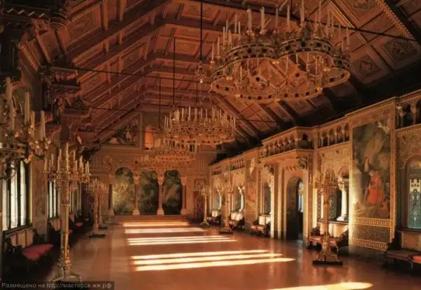 Замок Нойшванштайн представляет собой симбиоз трех различных, в плане использования, частей: это центральное строение замка – Палас и отходящие от него крылья. Левое носит название Kemenate Building (вход в замок), правое – Дом рыцарей. Внутреннее убранство грандиозного здания выполнено в невероятном смешении и многообразии стилей, принадлежащих к различным временным эпохам. В помещениях соседствуют мавританские, готические и, одновременно, барочные элементы, но ощущения безвкусной эклектической мешанины, как ни странно, не возникает. Вызывают, пожалуй, даже эстетическое восхищение колонны-сталактиты искусственного грота, вписанного в общую архитектуру сооружения, декадентский декор византийского стиля Тронного зала, в котором трон так и не был никогда установлен, изысканное и в то же время достаточно мощное освещение певческого зала – своеобразного замкового театра, предназначенного для постановок романтических произведений Вагнера. Всего замок насчитывает около 360 комнат и залов, но поскольку строительство в полном объеме так и не было закончено, окончательная отделка проводилась только в некоторых из них.