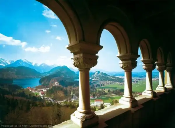 Архитекторам Нойшванштайна великолепно удалось выполнить один из краеугольных задач архитектуры – привязать сооружение к окружающей местности, вписать отдельно стоящий замок в природу верхней Баварии. Возвышающийся на одинокой скале с крутыми склонами, Neuschwanstein выглядит тем, чем и должен казаться – неприступным средневековым оборонительным сооружением. Из окон замка открывается невероятно живописный вид на долину Хоэншвангау, который Людвиг планировал улучшить, выстроив выше в горах еще один псевдостаринный замок, предназначением которого было сделать вид из Нойшванштайна еще более живописным. К сожалению, этим планам не суждено было сбыться.