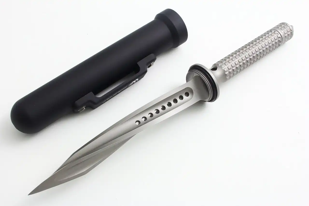 Нож изготавливается компанией Microtech. Они первые, кто начал делать фронтальные ножи. Все ножи этой компании стоят чуть больше, чем просто много и имеют фирменное клеймо в виде кинжала. Тут надо быть внимательнее, кастомные ножи Marfione и обычные ножи Microtech — разные вещи, хотя первые делаются по типу вторых и стоят ещё дороже. бывают экземпляры за 160к.