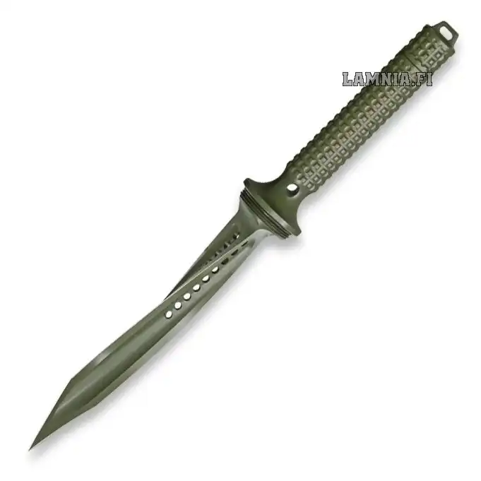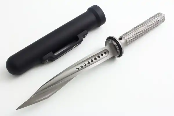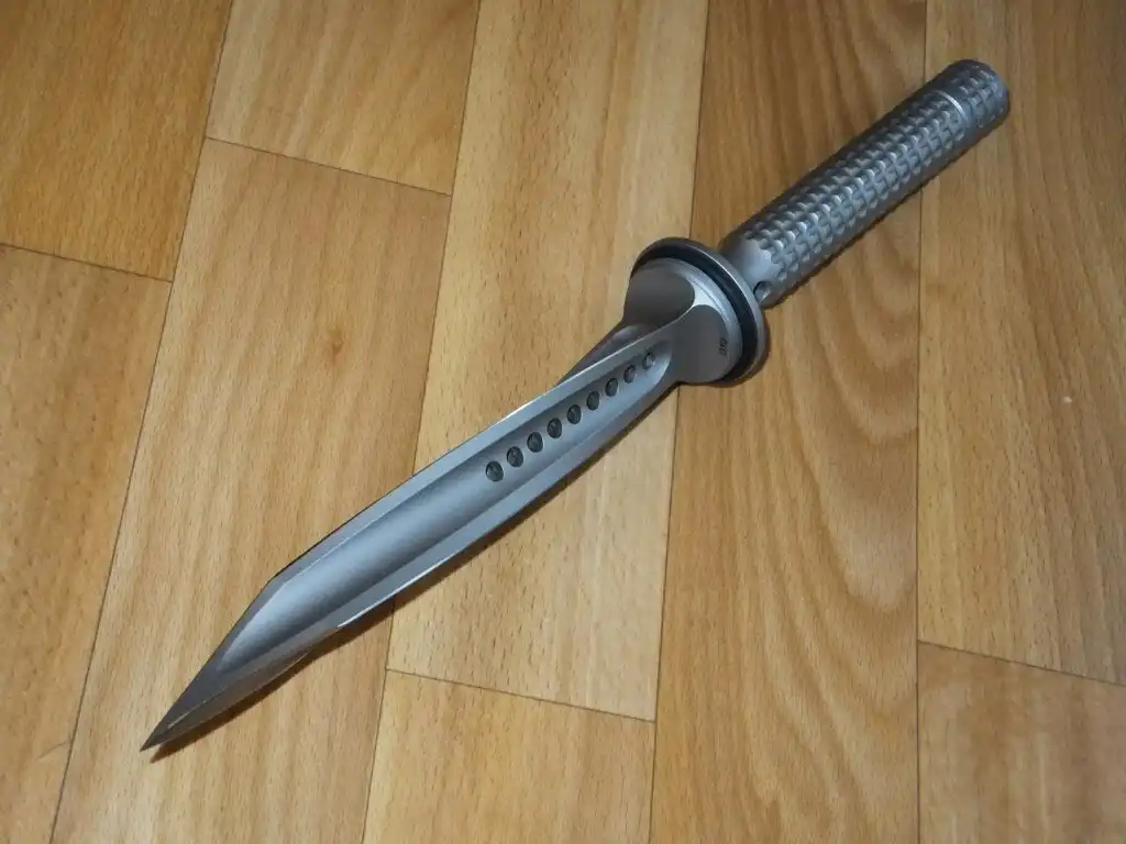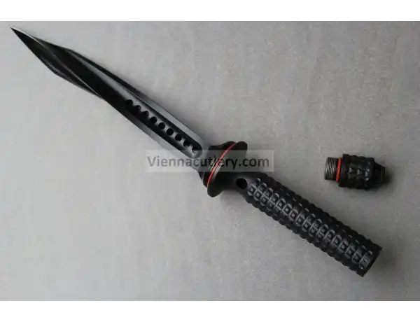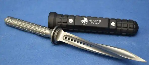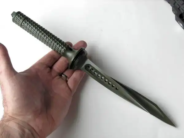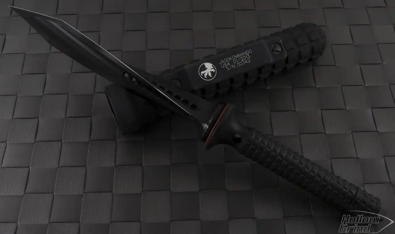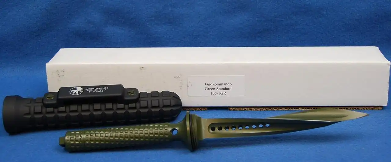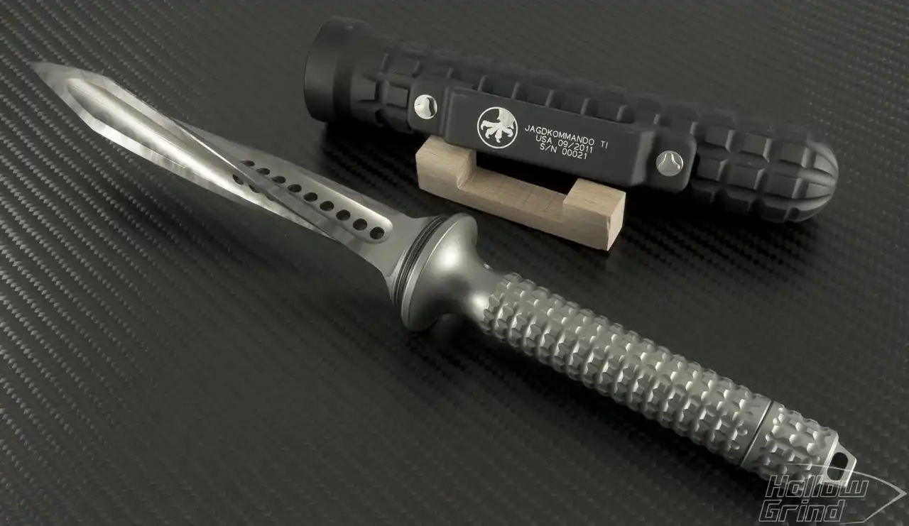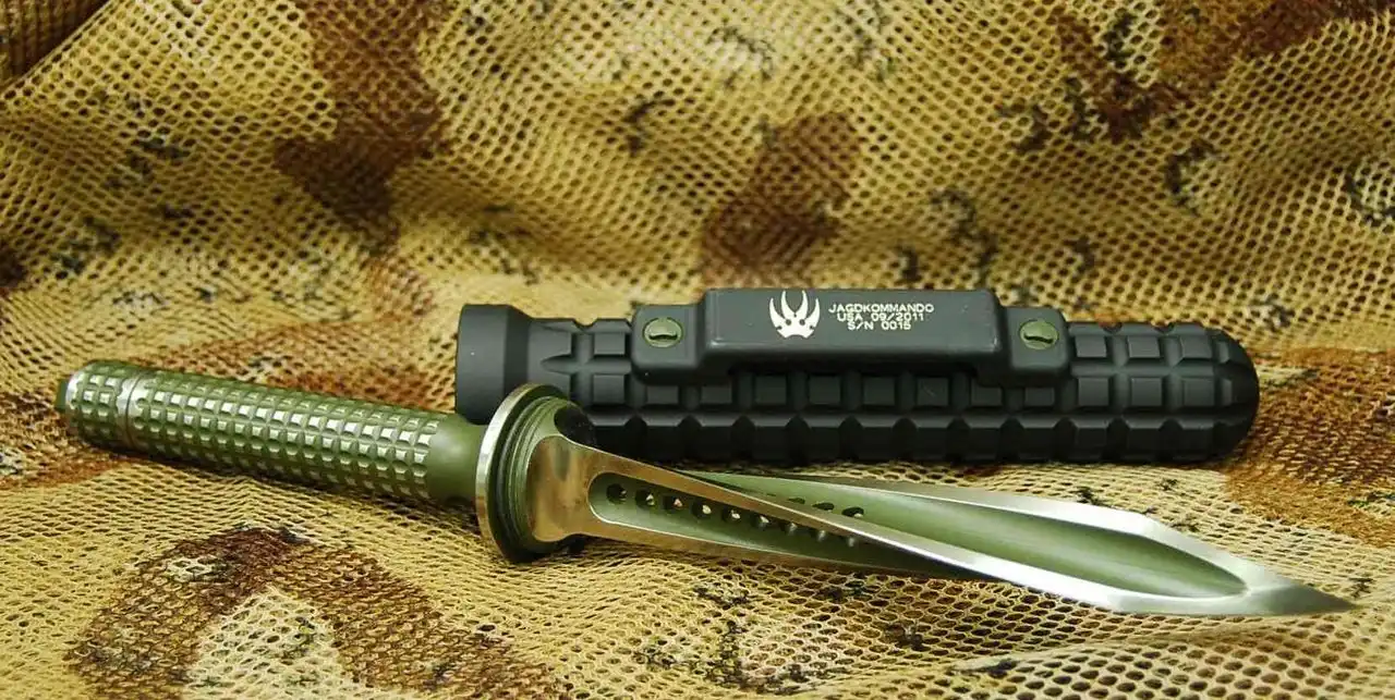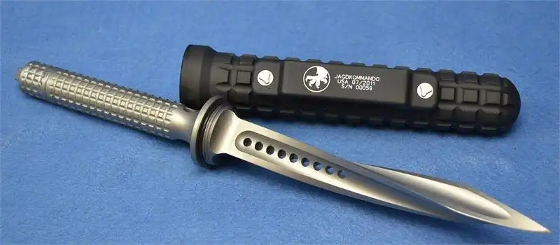 Нож отличает уникальная конструкция, сошедшееся звездой тройное лезвие с винтовым профилем. Длина лезвия составляет 7 дюймов или 17,78 см при общей длине 13 3/4 дюйма, то есть 34,93 см. Закрученное лезвие предназначается для легкого проникновения в тело и нанесения наибольшего вреда жертве. А на торце ручки у ножа находится «разбиватель стекла». Даже если предположить, что Jagdkommando предназначается для самообороны, то разбиватель стекла нужен, чтобы в экстренном случае пробить окно автомобиля и казнить водителя. Вероятнее всего, этот нож относится к запрещенным к обращению видам оружия, поэтому будем считать его арт-проектом. Арт-проектом, посвященным жестокости.