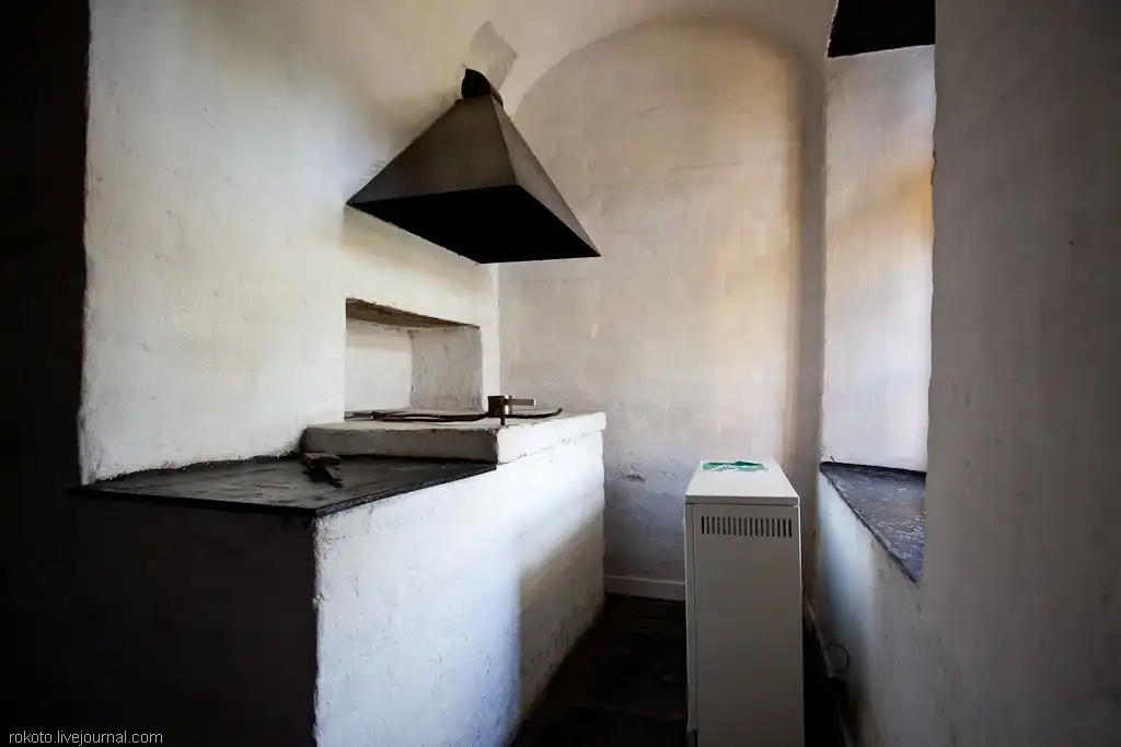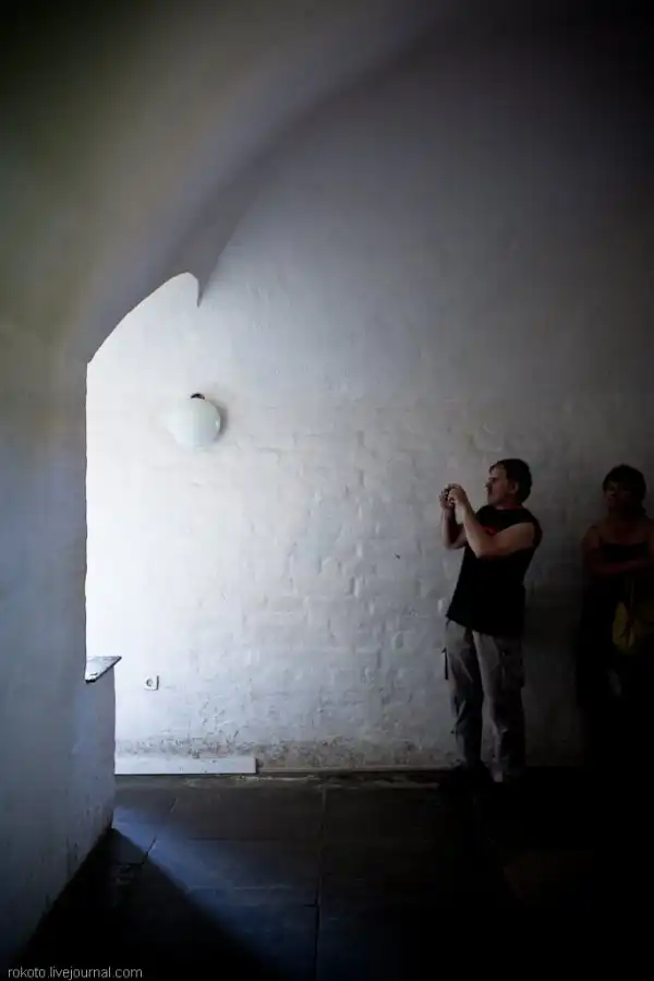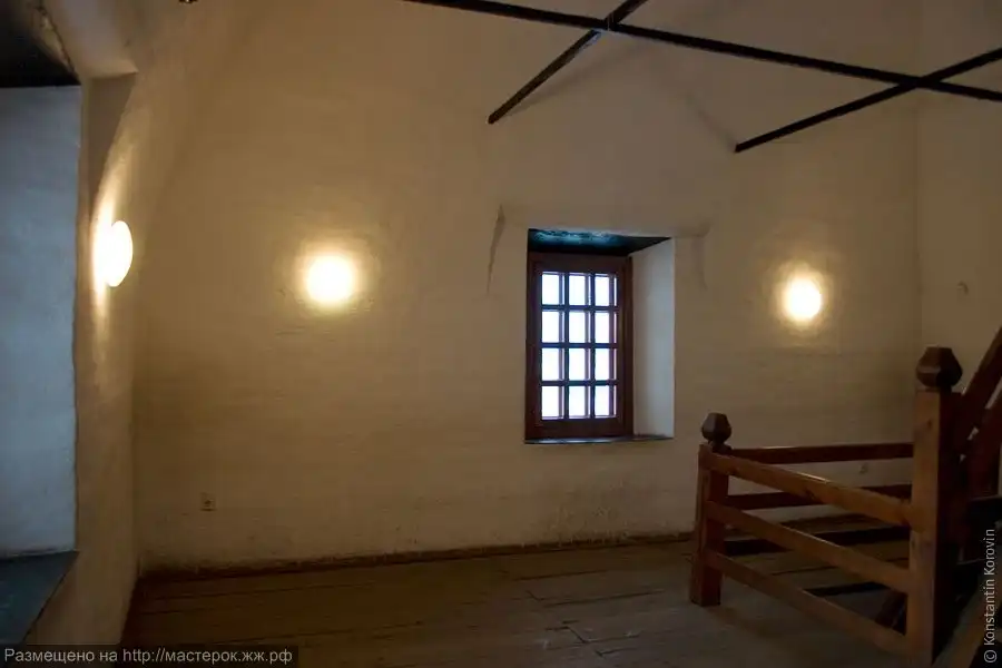 Башня задумывалась ими как административный и производственный комплекс. Высота ее примерно с двадцатиэтажный дом, ведь башня была своего рода сторожевой вышкой. Особо следует отметить комнату на четвертом этаже, называлась она акустической. Если в любом из ее углов вполголоса что-либо скажешь, то слова отчетливо слышались во всех других углах. Но вот если человек стоит за спиной говорящего, он ничего не сможет разобрать — услышит только бормотание.