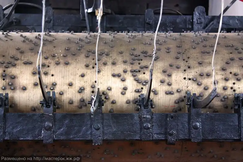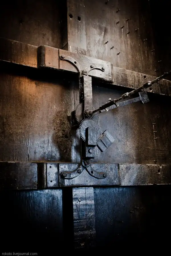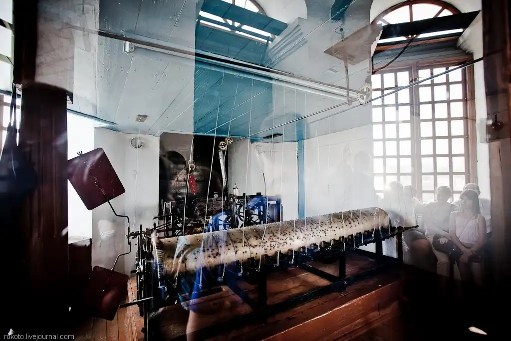 Если поднять голову в часовой комнате. В центре - отверстие, через которое проходят тросы к колокольному механизму. Колокольный механизм связан с часовым механизмом. Когда наступает нужное время, часовой механизм начинает играть колоколами одну из закодированных шипами мелодий. Напоминает старые клёвые квесты аля Мист.