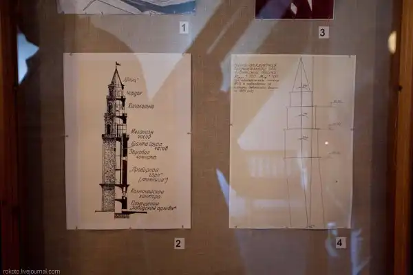 Потом идёт ещё несколько довольно скучных комнат (просто скучных, страшно уже не будет). В одной копия портрета Демидова, в другой можно отчеканить себе монету. Я не буду всё это показывать, т.к. это совершенно стандартная программа для кучи подобных экскурсий и мне это было совершенно не интересно. Вот, лучше посмотрите на схему башни. В одной из комнат выставлено довольно много всяких документов, фотографий и схем, но хорошенько рассмотреть времени вряд ли хватит.