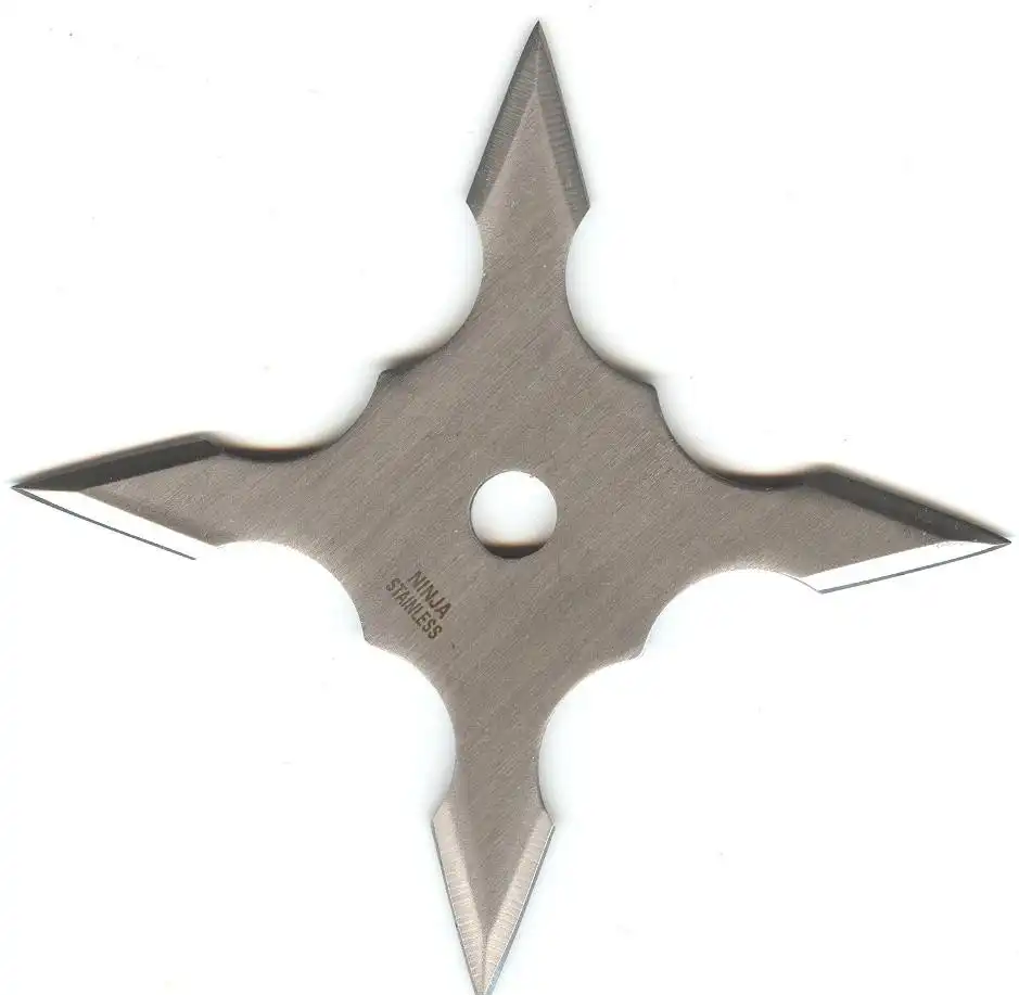 На Востоке идут другим путём, например, применяя ножи с ятаганной рукояткой, характерной особенностью которой является расширение задней части, так называемые «уши». Вот эти «уши» и играют роль стабилизатора при метании. Восток — дело тонкое. В справедливости этих слов убеждаешься, взглянув на метательный нож «сюрикен» (среди знатоков сей снаряд именуется по-разному, но здесь я предпочитаю пользоваться наиболее распространённым названием, под которым он известен широкой публике). Идея проста до гениальности: несколько лезвий, расположенных по кругу. При метании вероятность поражения цели одним из них приближается к 100 процентам. Для увеличения дальности броска «сюрикен» метают параллельно земле, закручивая, как пропеллер. Видов и типов метательных звёздочек существует великое множество, но есть у них одна общая черта — их боевые возможности сильно преувеличены. Виноват, как всегда, кинематограф, создавший целые сериалы, воспевающие восточные единоборства средневековых японских шпионов «ниндзя» и экзотические виды оружия, среди которых не малое место занимают и «сюрикены». Как правило, в кино одного «сюрикена», брошенного мастером, хватает для уничтожения противника. На практике всё гораздо скромнее. Виной всему — конструкция метательного ножа, не позволяющая нанести глубокую рану, поэтому летальный исход при использовании «сюрикена» может быть только при очень удачном попадании, например, в горло. В основном «сюрикены» служили для того, чтобы ошеломить противника или временно вывести его из строя, конечно, за исключением тех случаев, когда их клинки покрывались ядом.