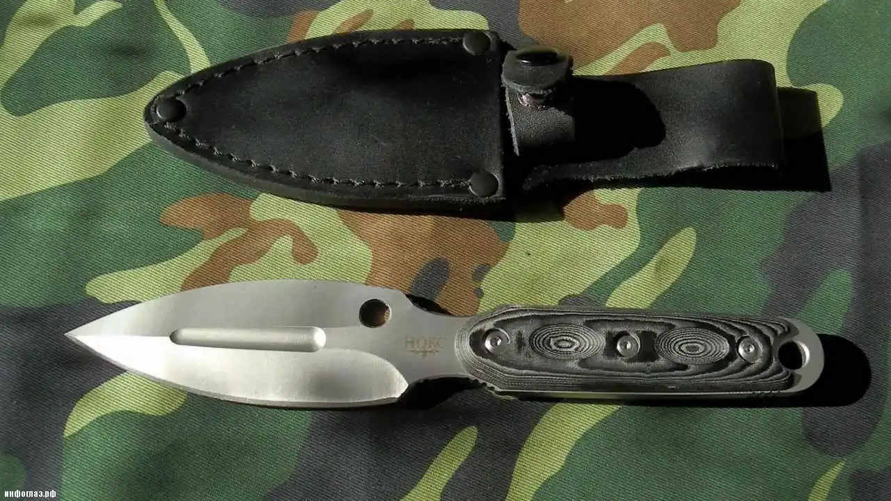 Те же критерии были реализованы и при разработке новейшего армейского ножа «Бусурманин» и ножей для спецподразделений «Эльф» и «Катран», правда два последних образца имеют обоюдоострую заточку клинка, более того, с одной стороны она выполнена волнообразной, так что метать их можно только за рукоятку. Любая попытка метнуть за клинок может окончиться серьёзной травмой пальцев. Слабым местом таких ножей, как HP и «Катран» является гарда, она выполнена из листового металла и может деформироваться при неудачном попадании ножа. Монолитные гарды ножей «Эльф» и «Бусурманин» переносят такие нагрузки достаточно хорошо. Все эти ножи должны заменить состоящий на вооружении штык-нож, который тоже можно использовать как метательный, но при этом надо помнить, что его конструкция не рассчитана на такие большие нагрузки и весьма вероятна поломка клинка или в области отверстия под стыковку с ножнами, или в месте крепления к рукоятке.