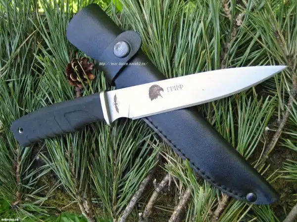 Прекрасно метается и нож «Гриф» американской компании Gold Steel. Этот нож выполнен в стиле упрощённого ножа для выживания. Конструкция предельно проста. Симметричный клинок с односторонней заточкой, рудиментарная гарда, рукоятка, обмотанная шнуром. Нож имеет достаточно солидные габариты и толщину клинка 5,5 мм. Из-за односторонней заточки такой нож можно метать не только за рукоятку, но и за клинок.