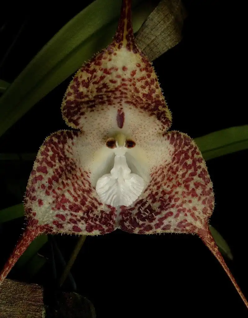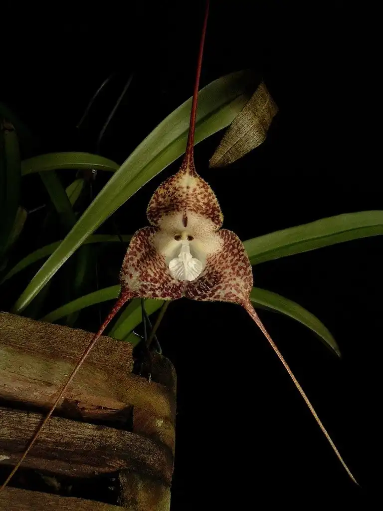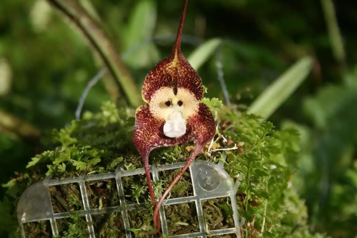 Это необычное растение на действительно существует, и этот удивительный цветок похож на улыбающуюся мордашку очень маленькой обезьянки. Научное название этого очень редкого цветка — «Dracula simia», намекающее на сходство с двумя длинными клыками знаменитого вампира, а второе слово означает «обезьяна».