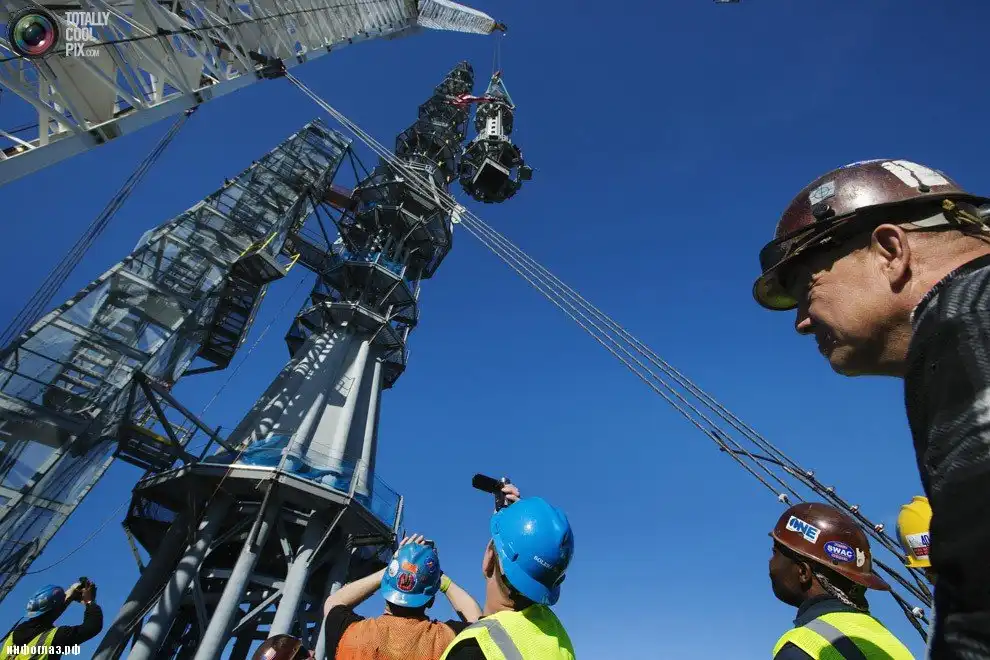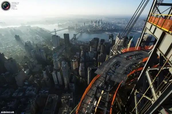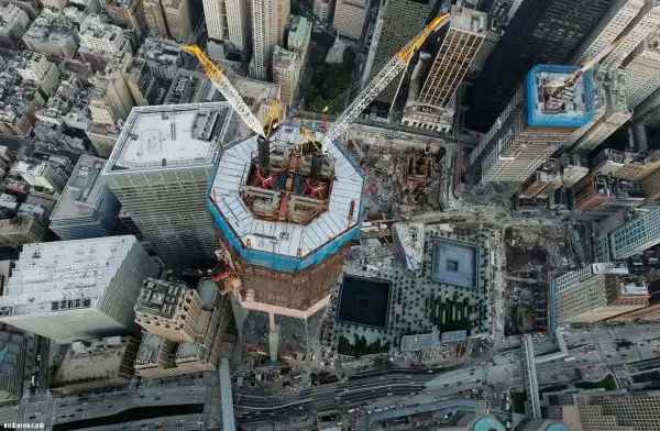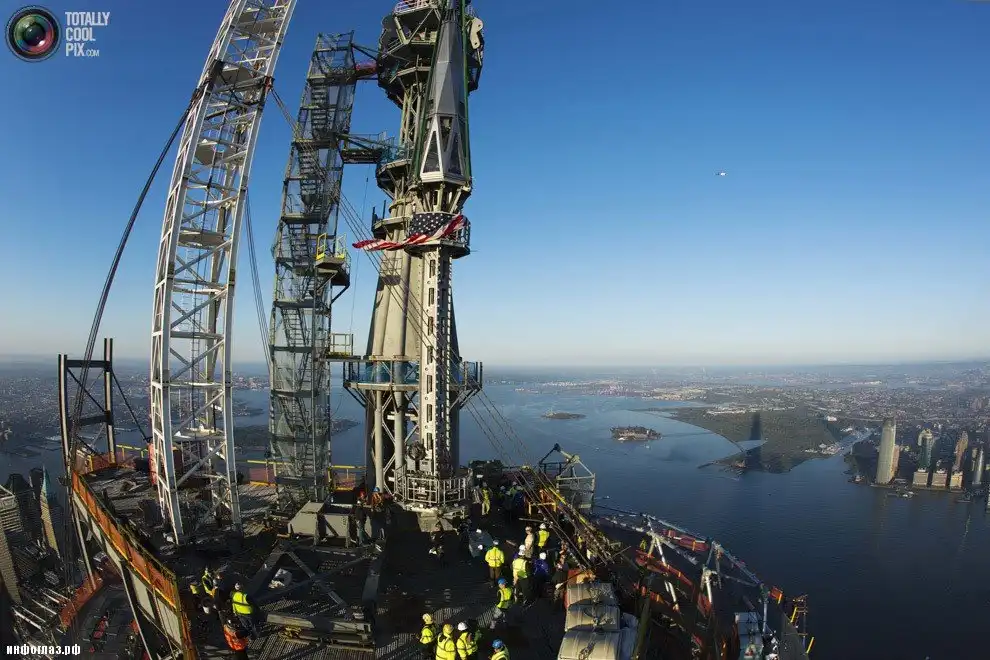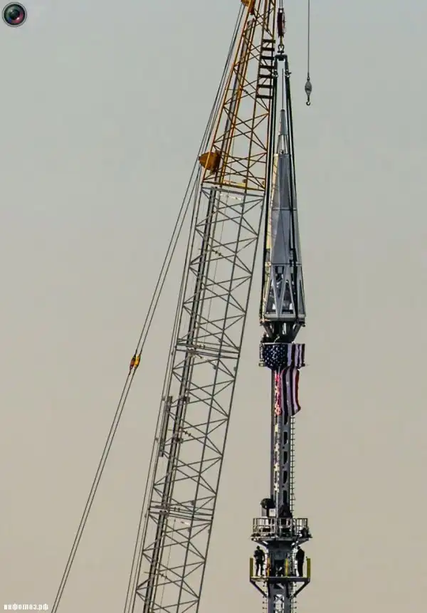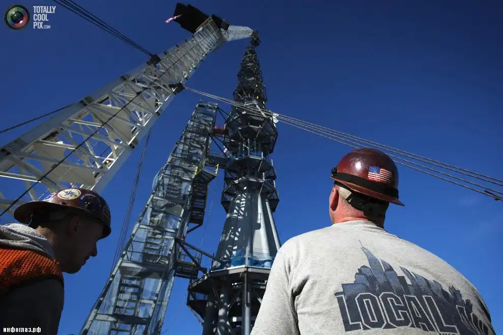 Установка шпиля на здании Всемирного торгового центра 1 в Нью-Йорке. (GARY HE/REUTERS)