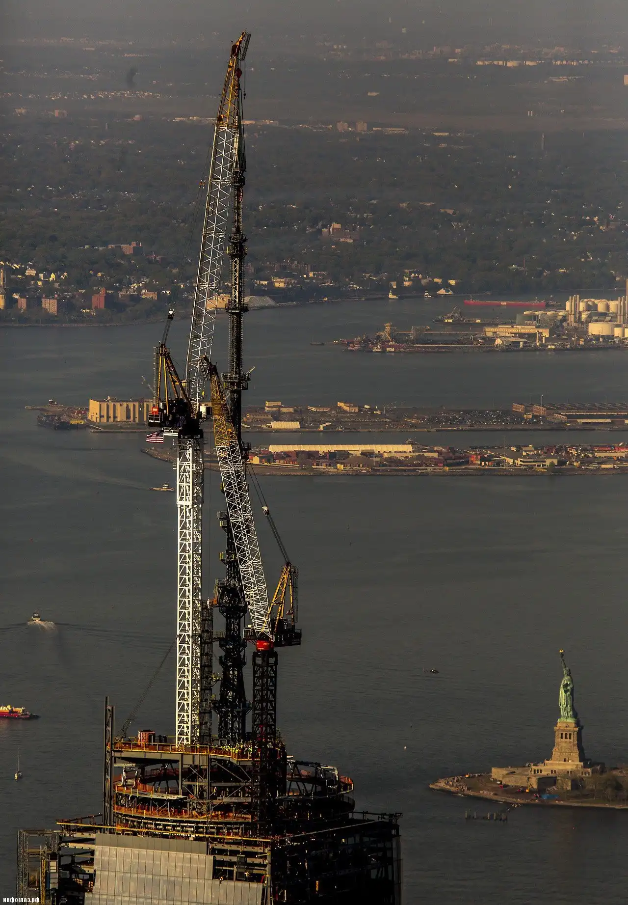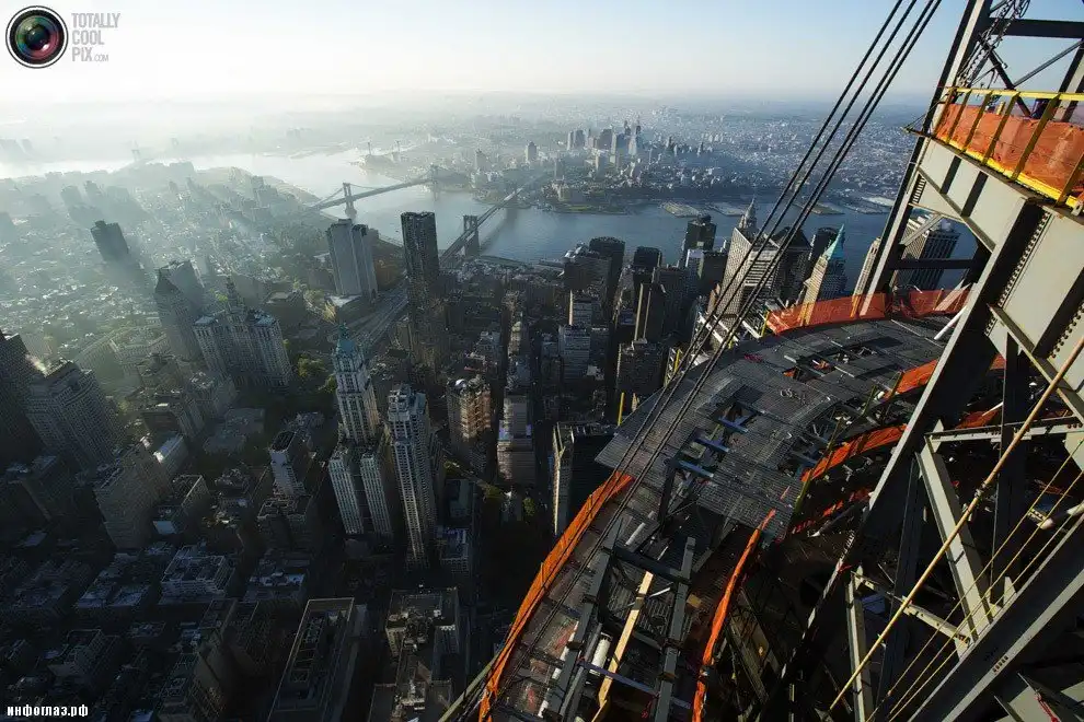 Кран устанавливает верхнюю часть шпиля на здании Всемирного торгового центра 1 в Нью-Йорке. (LUCAS JACKSON/REUTERS)