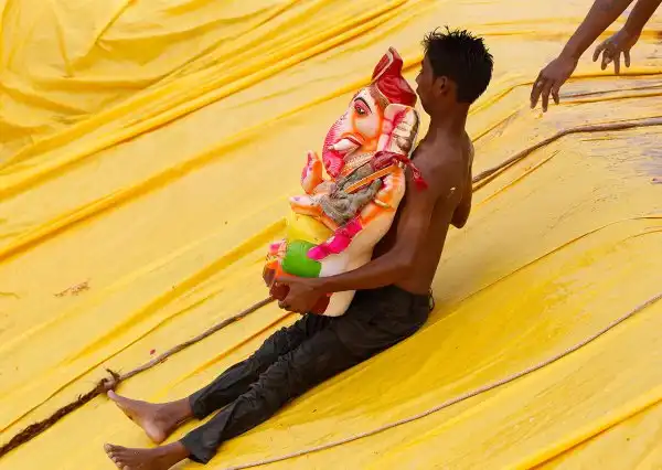 Поэтому после окончания церемонии рабочие вытаскивают идолы обратно на берег, чтобы они не загрязняли водоемы. Возникают такие локальные «божественные» свалки из Ганеш.