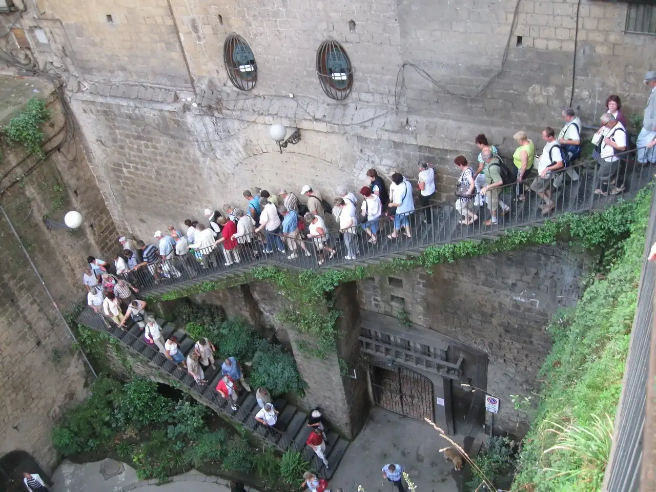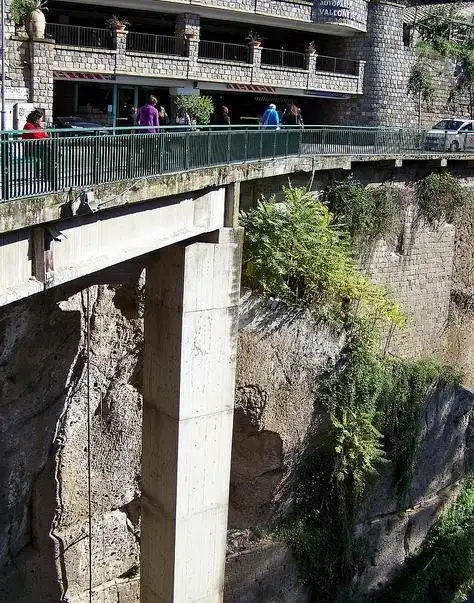 Одна сторона — обычные дома, а противоположная — вот такая. Конечно есть заграждение по всей извилитости этой улицы, на уровне локтя, но спланировать ничего не стоит. Рядом с ограждением тротуар, по которому все ходят. . Туристы, конечно, заглядывают вниз, фотографируют. Коленки подкашиваются. Провал достаточно глубокий, метров 100 отвесной каменной стены. По этой улице и автобусы ходят.