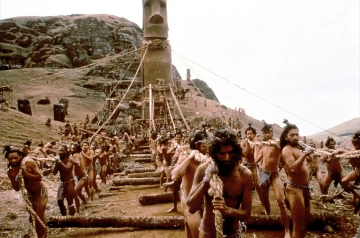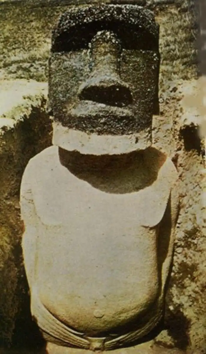 Совершенно необъяснимыми казались около 200 гигантских каменных изваяний — «Моаи», расположенные на массивных постаментах вдоль побережья острова с жалкой растительностью, вдали от каменоломен. Большинство статуй располагались на массивных постаментах. Еще не менее 700 скульптур, в разной степени готовности, были оставлены в карьерах или на древних дорогах, связывающих карьеры с побережьем. Складывалось впечатление, что скульпторы внезапно оставили свои инструменты и прекратили работу..