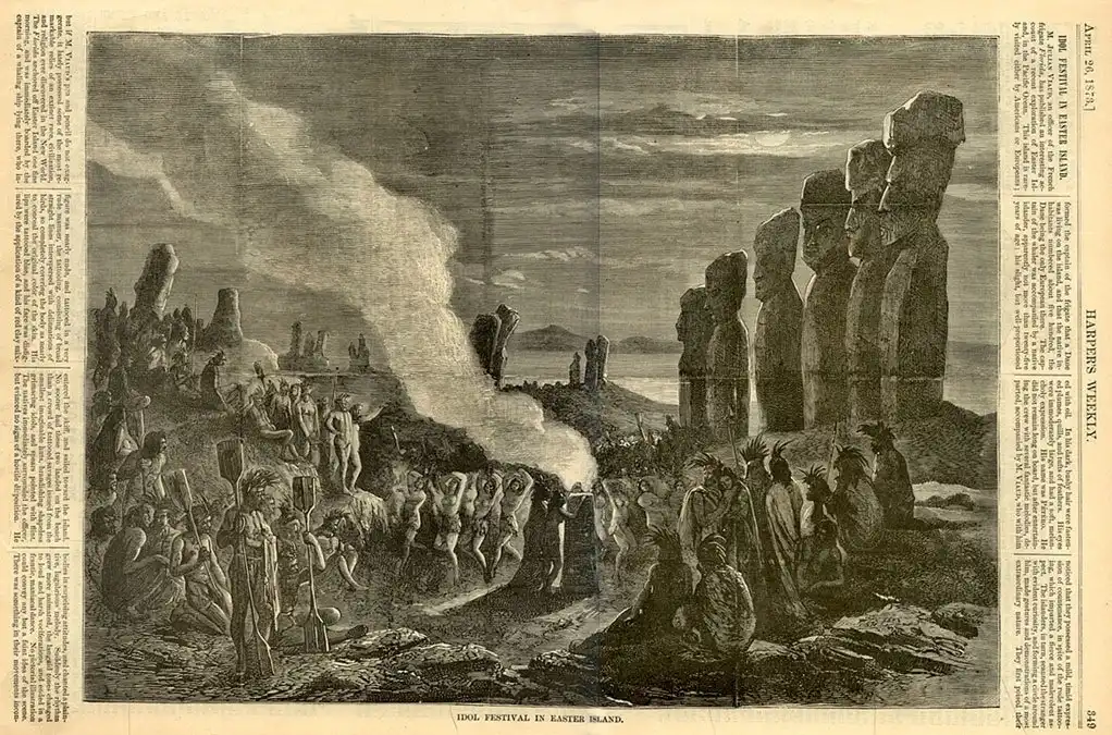 Гравюра 1873 года из английской газеты «Harper Weekly». Гравюра подписана: «Easter Island Stone Idols Festival Dancing Tatoos» (Фестиваль татуированных танцовщиц у каменных идолов острова Пасхи).