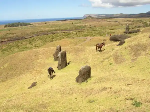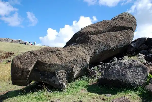 Подавляющее большинство статуй лежат незаконченные в каменоломнях или вдоль древних дорог. Некоторые из них застыли в глубине кратера вулкана Рано-Рараку, некоторые выходят за гребень вулкана и словно направляются к океану. Все как будто остановилось в один момент, охваченное вихрем неизвестного катаклизма. Почему скульпторы внезапно прекратили свою работу? Все оставлено на месте — и каменные топоры, и незаконченные статуи, и каменные гиганты, словно застывшие на пути в своем движении, как будто люди просто на минуту оставили свою работу да так и не смогли вернуться к ней.