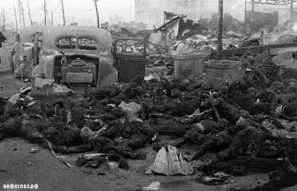 Всего тогда в 1945 выгорел 41 квадратный километр площади города, который населяло около 10 миллионов человек, было разрушено 40% всего жилого фонда (330 тысяч домов).