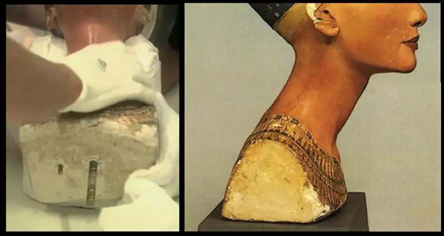 Во времена Борхардта компьютерной томографии не было, но сейчас она есть и многое проясняет. С её помощью выяснилась странная вещь – внутри бюста находится вторая скульптура. Получается, художник сначала работал с камнем, сделав заготовку, а потом лепил на нее гипс, придавая более совершенные формы. Это просто и понятно, но ни один из древних мастеров не пользовался подобной технологией изготовления скульптуры. Археологии Древнего Египта такие случаи не известны. Это важнейший аргумент в пользу всего лишь столетнего возраста бюста, так как речь идет о современной технологии подделок.