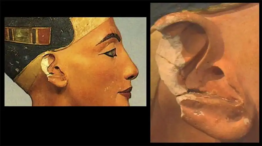 Правое ухо головы царицы, здесь видна работа фальсификатора. Он демонстративно оставил следы от реконструкции поврежденного уха, которая понадобилась ему только для того, чтобы нанесенные им же самим повреждения выглядели естественно. По ошибке мастера на ухе нет следов тысячелетней эрозии. Видно, что краску на нем соскоблили будто вчера, кусочек гипса был отколот и тут же приклеен, то есть части скульптуры не лежали отдельно друг от друга в песке более трех тысяч лет.