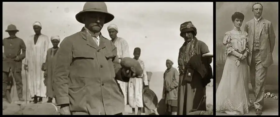 Руководитель археологической экспедиции Людвиг Борхардт на раскопках в Амарне, 1912 год. Справа: брат короля Саксонии, герцог Иоганн-Георг рядом со своей второй женой, герцогиней Марией Иммакулой. По странному совпадению, прибытие уважаемой делегации совпало с обнаружением бюста – все произошло 6 декабря 1912 года.