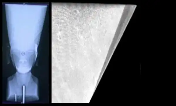 Слева: рентгенограмма бюста. Справа: при увеличении хорошо видно наложение двух слоев гипса различной плотности. Очевидно, это было нужно, чтобы привести скульптуру хоть к какому-то равновесию. Видно, что сначала был наложен менее плотный гипс, но фигура осталась неустойчивой. Тогда был добавлен новый, более плотный слой гипса. Бюст стал более устойчивым, но явно недостаточно: при небольшом толчке фигура потеряла бы равновесие.