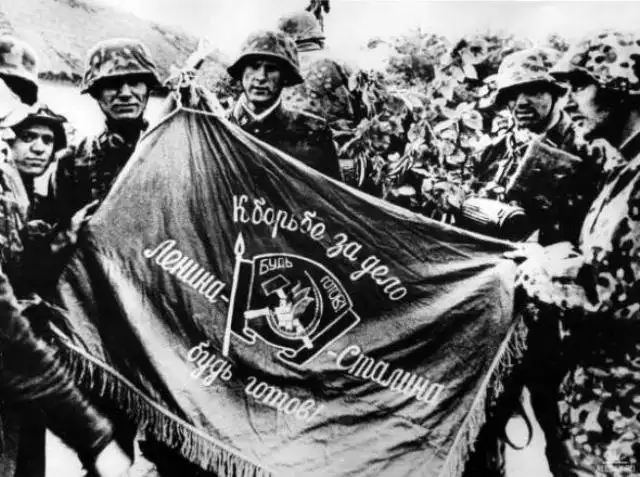 Немецкие солдаты с захваченным советским флагом
