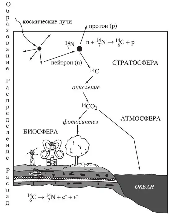1.14C образуется в верхних слоях атмосферы под действием космических лучей, затем перемешивается в атмосфере, входя в состав углекислого газа. При этом процентное содержание 14C в атмосфере является постоянным и не зависит ни от времени, ни от места, несмотря на неоднородность самой атмосферы и распад изотопов.