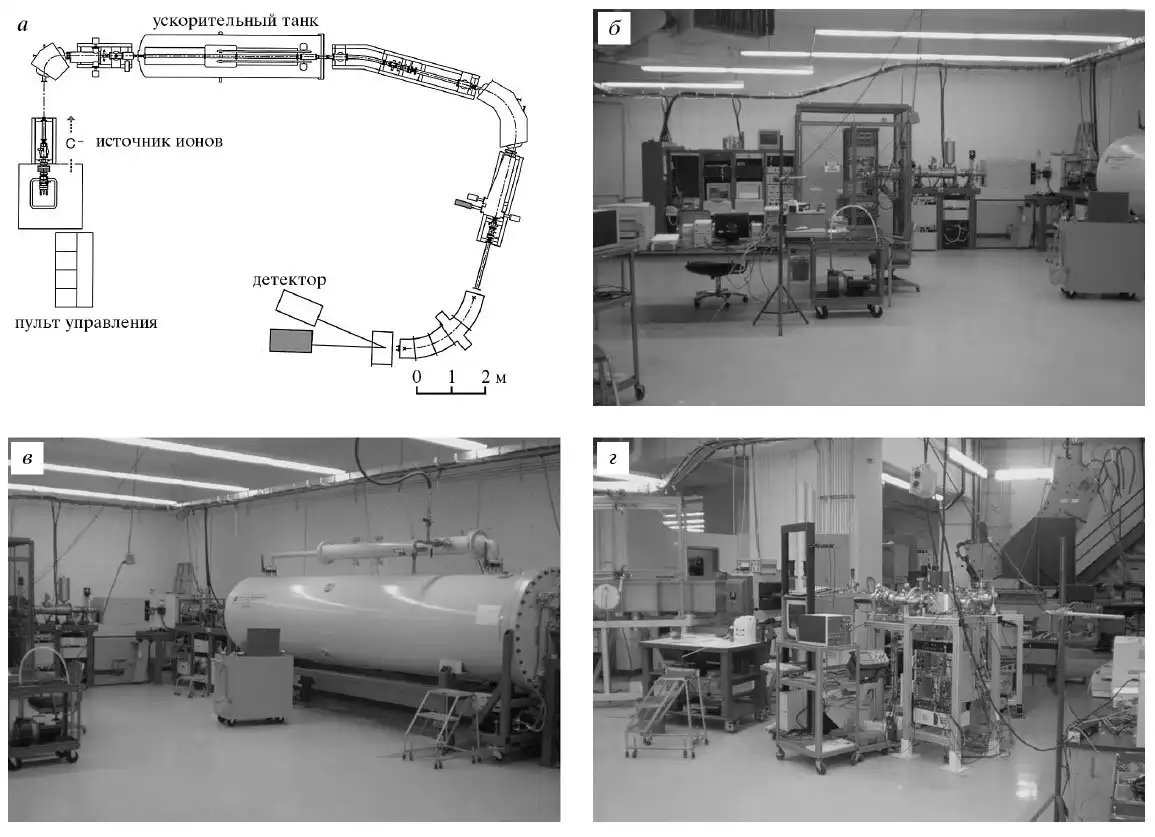 Ускорительный масс-спектрометр Университета Аризоны (г. Тусон, штат Аризона, США) производства компании National Electrostatics Corporation: а – схема, б – пульт управления и источник ионов С¯, в – ускорительный танк, г – детектор изотопов углерода. Фото Дж.С. Бурра