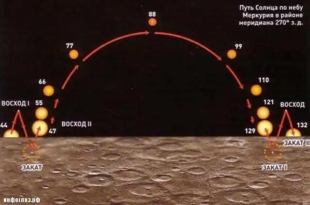 Совсем по-иному выглядит ход Солнца вблизи 90° и 270° з.д. Здесь Светило выписывает совсем удивительные пируэты — за сутки происходит по три восхода и по три заката. Утром из-за горизонта на востоке очень медленно появляется яркий светящийся диск громадного размера (в 3 раза больше, чем на земном небосводе), он немного поднимается над горизонтом,останавливается, а затем идет вниз и ненадолго скрывается за горизонтом. Вскоре следует повторный восход, после которого Солнце начинает медленно ползти по небу вверх, постепенно ускоряя свой ход и при этом быстро уменьшаясь в размерах и тyскнея. Точку зенита это «маленькое» Солнце пролетает на большой скорости, а потом замедляет свой бег, растет в размерах и медленно скрывается за вечерним горизонтом. Вскоре после первого заката Солнце поднимается вновь на небольшую высоту, ненадолго застывает на месте, а затем снова опускается к горизонту и заходит окончательно. Такие «зигзаги» солнечного хода происходят оттого, что на коротком отрезке орбиты при прохождении перигелия (минимального расстояния от Солнца угловая скорость движения Меркурия по орбите вокруг Солнца становится больше, чем угловая скорость его вращения вокруг оси, что приводит к перемещению Солнца на небосводе планеты в течение короткого промежутка времени (около двух земных суток) вспять его обычному ходу. А вот звезды на небе Меркурия перемещаются втрое быстрее, чем Солнце. Звезда, появившаяся одновременно с Солнцем над утренним горизонтом, зайдет на западе еще до полудня, то есть раньше, чем Солнце доберется до зенита, и успеет еще раз взойти на востоке, пока Солнце не село.