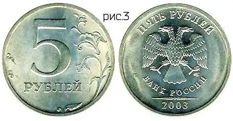 Ценная монета современной России - 5 рублей 2003 года, была выпущена Санкт-Петербургским монетным двором. Точный тираж неизвестен, но он очень маленький. В целом монета самая обычная, без всяких там широких кантов, смещенных букв или искаженных узоров. Единственный признак - это штамп "СПМД" под правой лапой двуглавого орла (рис.3).