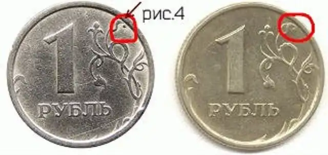 Легендарная пятирублевка имеет следующие отличительные признаки: скругленный верхний левый угол цифры «5», ее гаста справа имеет острые углы, заостренные ступеньки в нижней части букв слова «РУБЛЕЙ», лист растения касается канта, точка малая, маленький овальный знак монетного двора (рис.10).