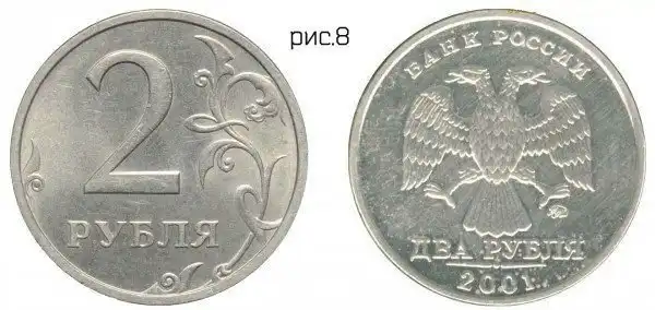 Официально монеты 2001 года номиналом 2 рубля регулярного хождения не чеканились ни одним монетным двором. Однако в обращение всё же попала небольшая партия двухрублевых монет Московского монетного двора. Точное их количество на сегодняшний день неизвестно. В зависимости от состояния, для регулярной (не юбилейной) монеты 2 рубля 2001 года стоимость колеблется от 30000 до 50000 рублей, что позволяет отнести её к самым дорогим монетам России (рис.8).