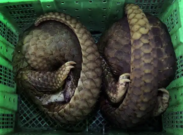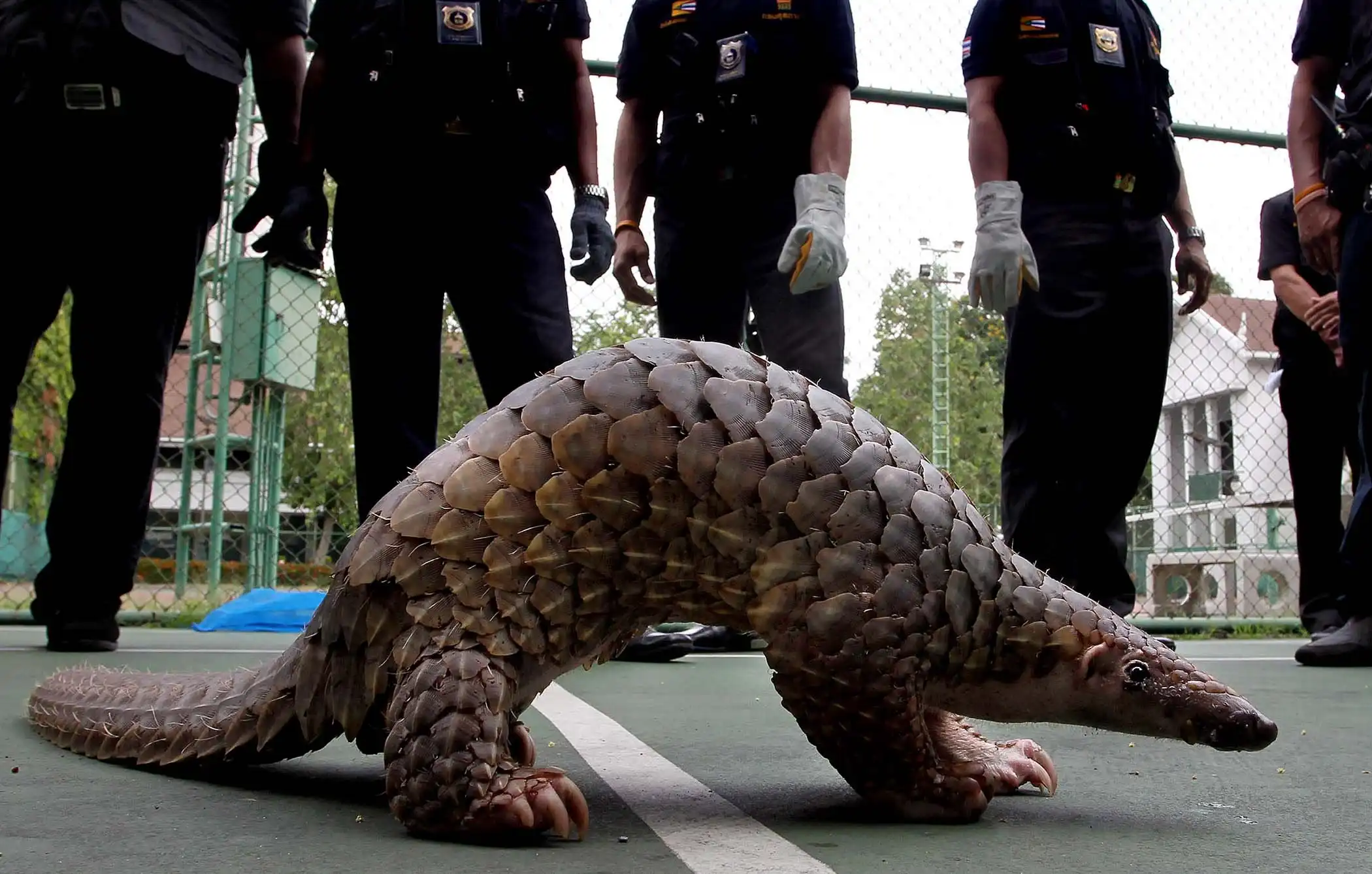 В 2012 году Тайские таможенники смотрят на панголина во время пресс-конференции в Бангкоке, Таиланд. Работники таможенной службы спасли 138 находящихся под угрозой исчезновения панголинов общей стоимостю $46 000, которых собирались вывезти из страны и съесть. (Apichart Weerawong/Associated Press)