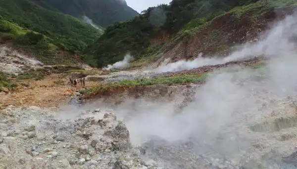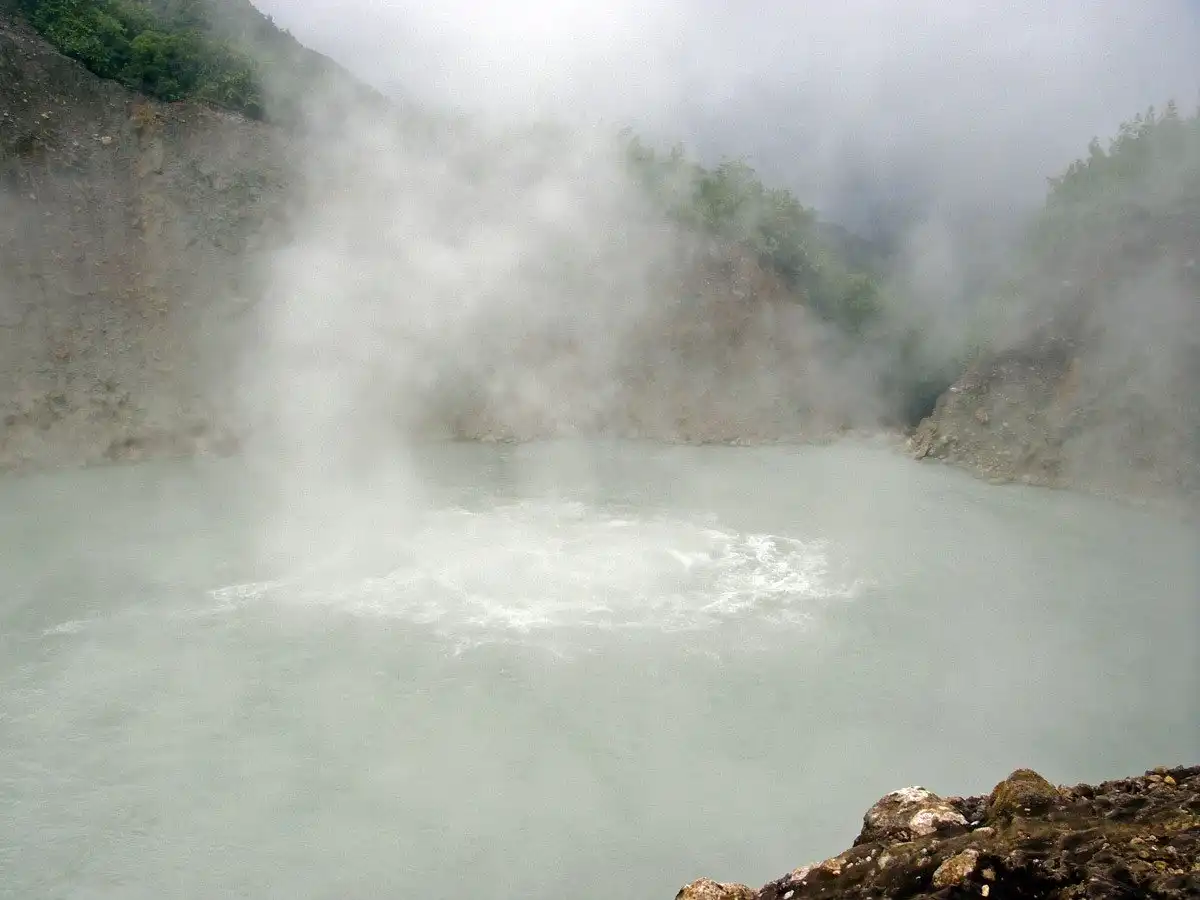 Недалеко от Кипящего озера течет горная серная речка, которая образует множество природных бассейнов. Здесь вы сможете искупаться и восстановить свои силы. Те, кто побывал здесь, утверждают, что этот трудный путь стоит того, чтобы взглянуть на удивительное чудо природы!