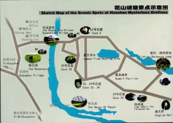 Как сообщают туристические сайты, только во время проведения предварительного осмотра пещер, экспертов поразил масштаб увиденного. Ни один из уже известных комплексов не превосходит Хуашаньский. К примеру, общая площадь лишь двух из пещер второй и тридцать пятой превышает 17000 кв.м. Объем вывезенного из данных пещер щебня и грунта достиг 20 тысяч куб.м. На откачку 18 тысяч тонн воды понадобилось три насоса и более 12 суток. Сейчас эти пещеры открыты для посещения, в пещере №35 находится 26 колонн из камня, у всех помещений причудливая многоярусная форма. Здесь можно полюбоваться каменными террасами, павильонами, бассейнами и прудами, каменными мостиками. Кое-где есть барельефы.