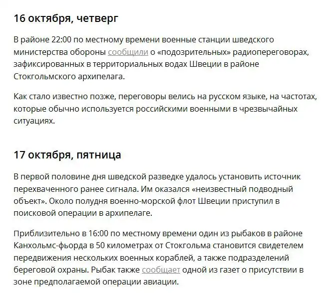 С 16 октября шведский военно-морской флот при поддержке авиации и наземных подразделений ищет «неизвестный подводный объект», который, по данным Минобороны Швеции, может являться российской подводной лодкой, терпящей бедствие в территориальных водах этого государства. Представление о масштабе проводимой операции дает специально составленная хронология событий.