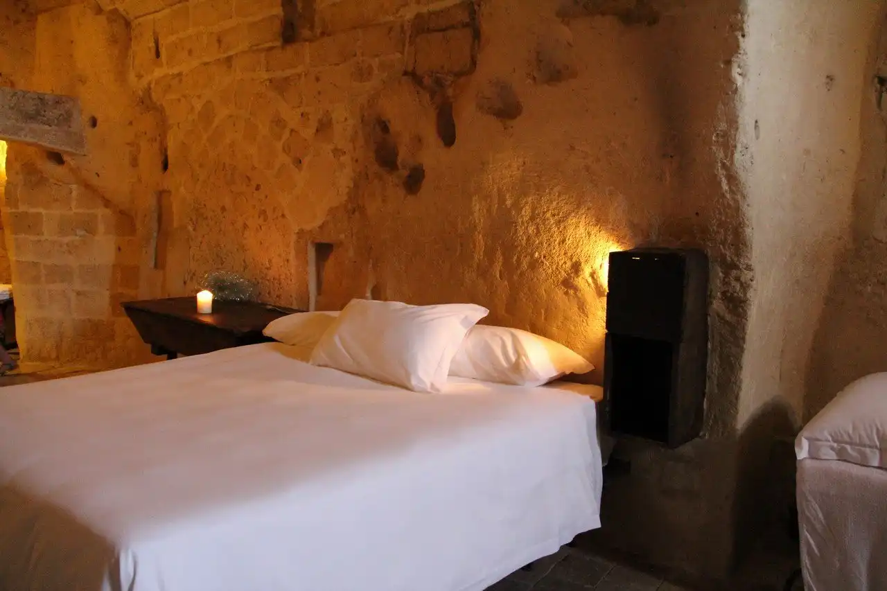 Гостиничный город под названием Sassi di Matera стал уникальным экспериментом по интегрированию современных технологий в атмосферу средневекового прошлого. При этом удалось найти нестандартное решение и не превращать пещерный комплекс в обычный тематический парк. При первом взгляде на двери и ржавые ключи создается впечатление, что это вход в старый сарай. А между тем комнаты полны света и выглядят вполне комфортабельно. В отреставрированных отелях-пещерах есть все — от удобных кресел до Wi-Fi и роскошных ванных комнат. Помимо стен, о прошлом в некоторых гостиницах напоминают кровати, подвешенные в метре над полом на металлических тросах. Это дань старинным традициям Сасси. В средневековом городе люди жили в одних пещерах с животными, и подвешенные кровати гарантировали им относительную уединенность от домашней скотины. Зато животные вырабатывали дополнительное тепло и согревали своих хозяев.